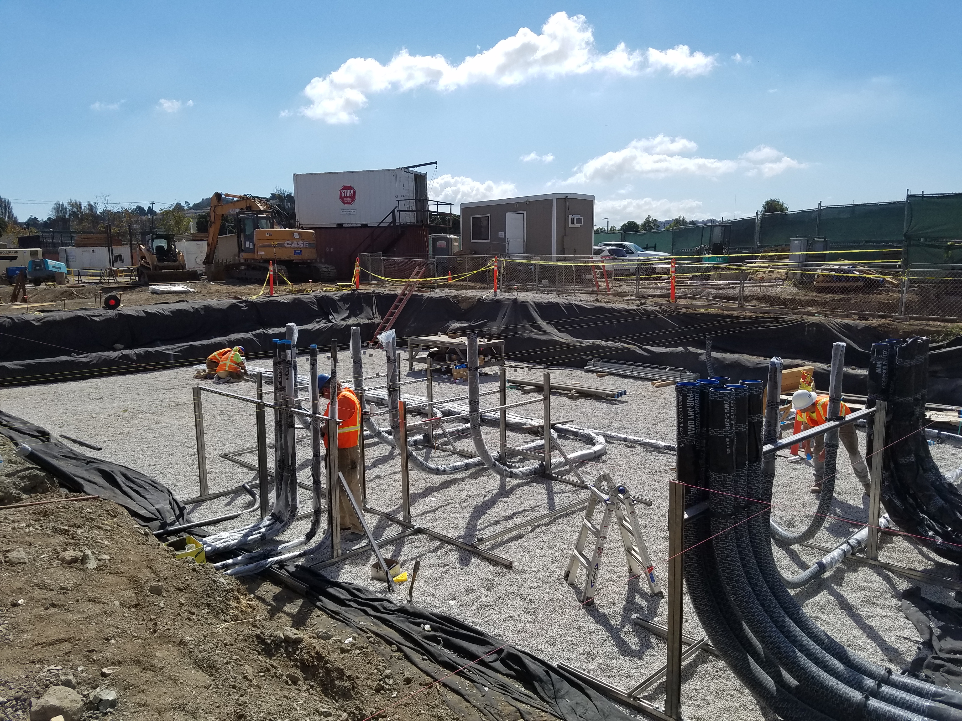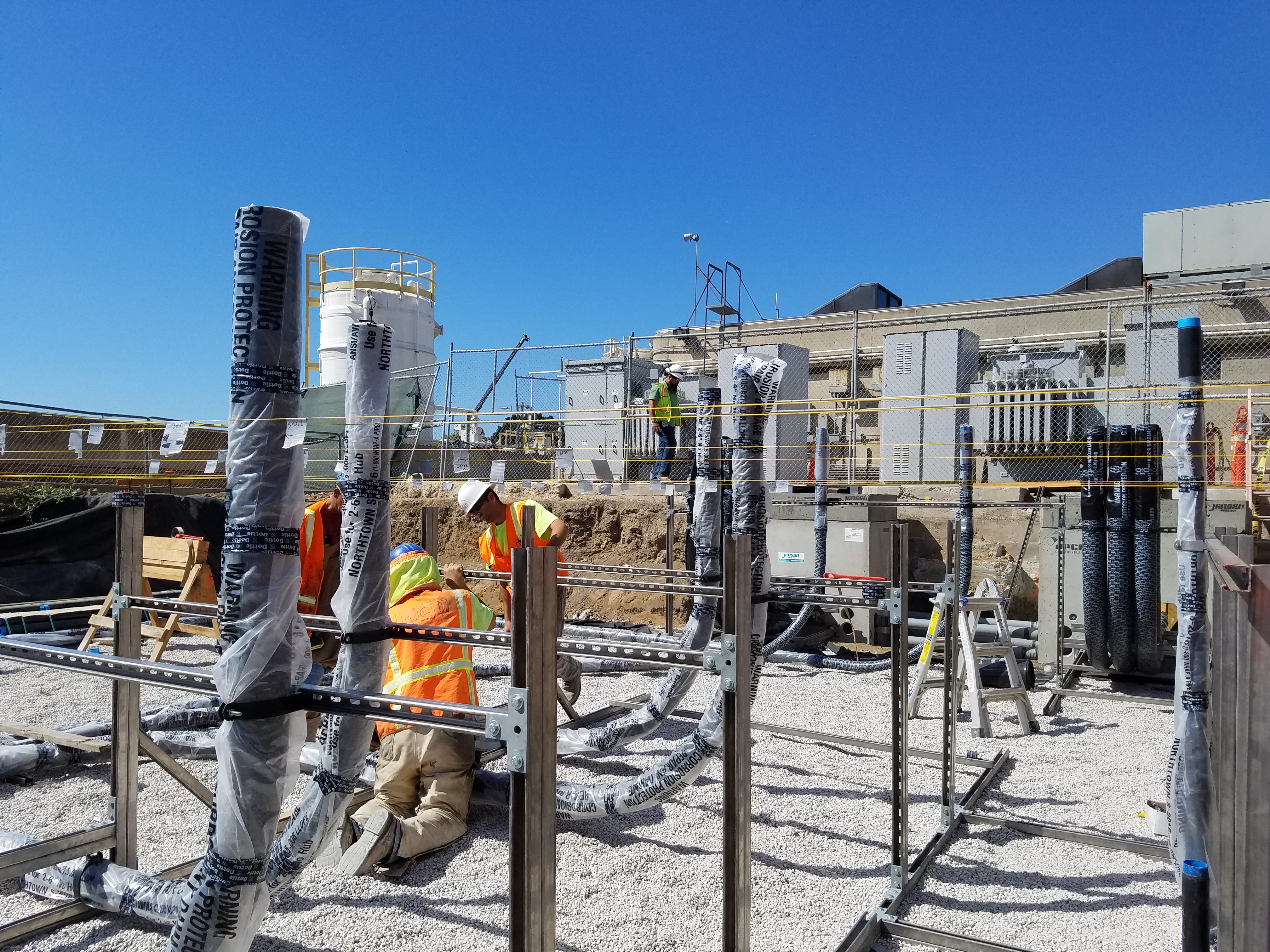 Below are photos depicting the installation of conduits under the building slab for the new electrical and control building.